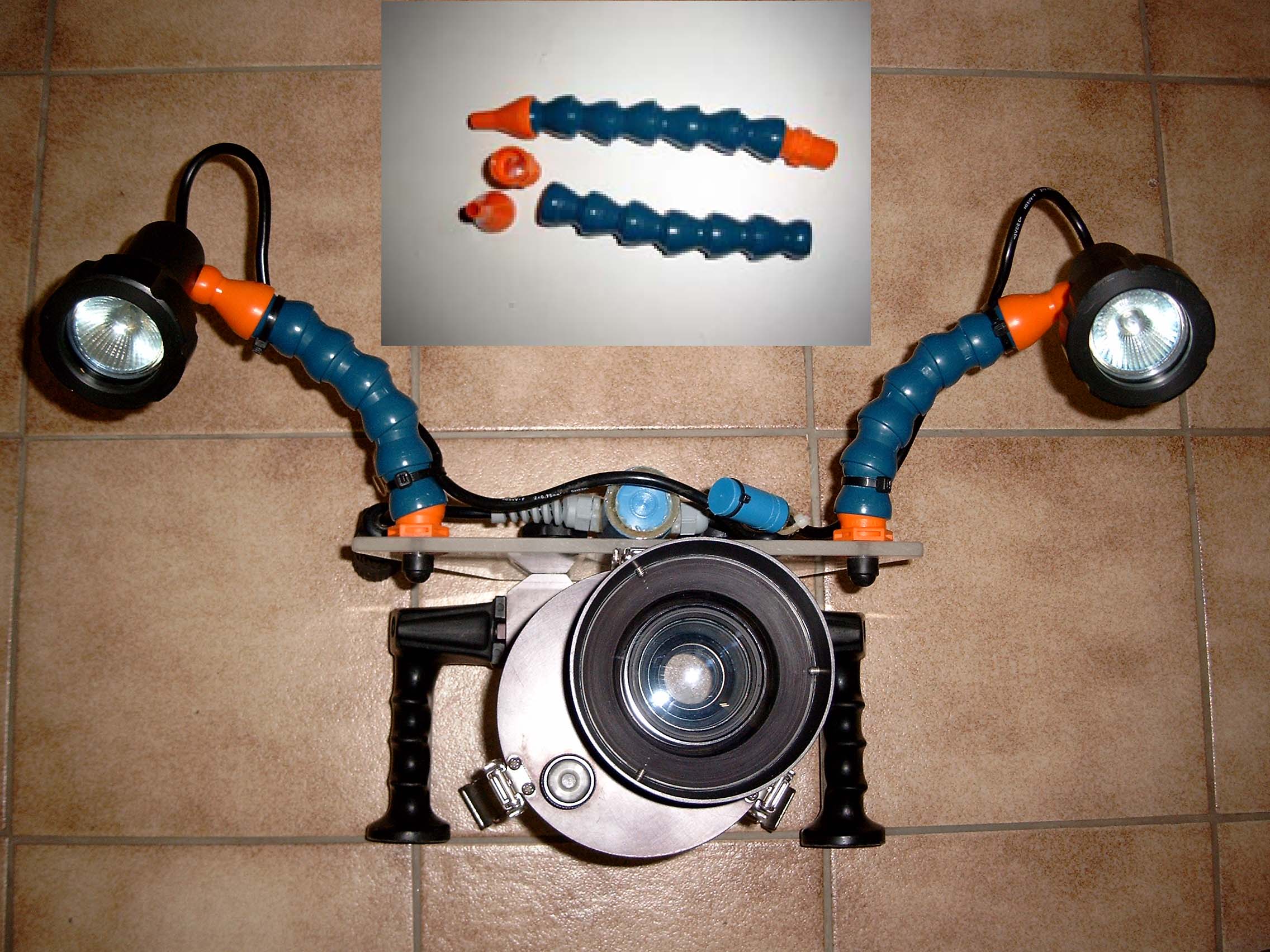 Also: das Teil ist mit Handleuchten, wie man sie gewöhnlich verwendet, zu betreiben. Diese Leuchten werden auf dem Leuchtenträger so angeordnet, dass die Frontscheiben der Leuchten auf einer Linie mit dem Frontglas des Videogehäuses auf gleicher Höhe verlaufen.